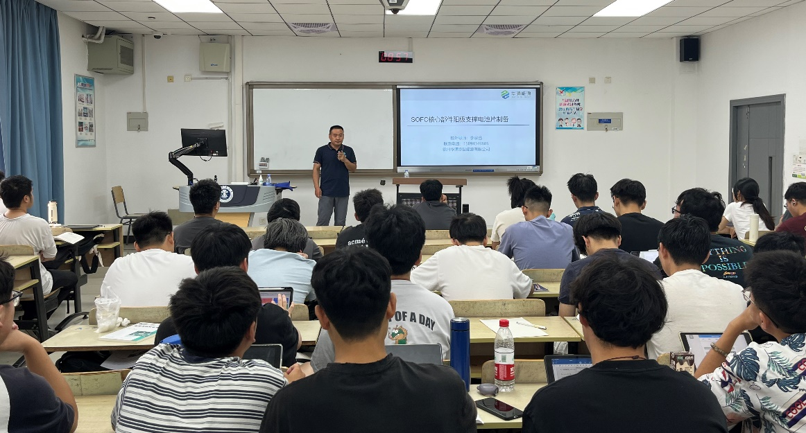 6月24日上午,李宗迅副总工以“SOFC核心部件阳极支撑电池片制备”为题开展授课,从粉体研磨、浆料制备、阳极支撑体流延、电解质层与阴极层丝网印刷等多个环节,详细讲解了固体氧化物燃料电池一线生产线的制备工艺,对专业课程《氢能技术与应用》燃料电池课堂理论知识形成了有力支撑。