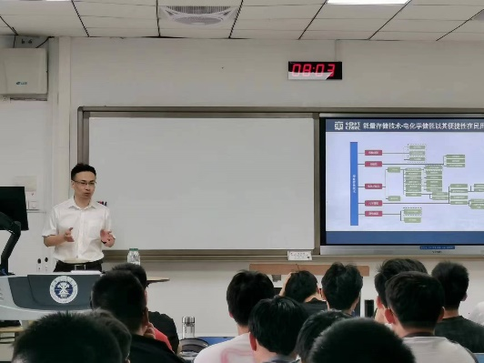 6月11日上午,荆葛总工程师以“超级电容器电化学储能机理及工程实现”为题开展授课。荆葛总工是中国中车资深技术专家,现任宁波中车新能源科技有限公司总工程师,中国超级电容产业联盟青年理事,中国电子元件行业协会科学技术委员会委员,中国电工技术学会超级电容器与储能技术专业委员会委员。课堂上,荆葛总工围绕超级电容器储能机理、主要材料、组装技术、生产工艺、测试方法等进行了深入浅出的介绍,探讨了未来超级电容器产业发展的主要机遇和挑战,鼓励同学们投身储能技术产业,为在场学生未来学习和职业规划提供了宝贵的建议。