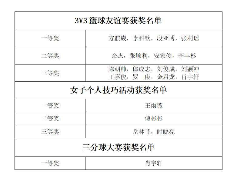 本次比赛过程紧张激烈,却又不缺少欢声笑语。秉承着友谊第一,比赛第二的精神。同学们在尊重规则、尊重裁判、尊重对手、尊重比赛的前提下,奋力拼搏,努力竞争,赛出了风采,赛出了精神。除3V3篮球友谊赛选手互相对抗之外,还设立了女子技巧大赛和三分球大赛。最终根据得分情况,评审出了本次比赛的一、二、三等奖,结果如下。