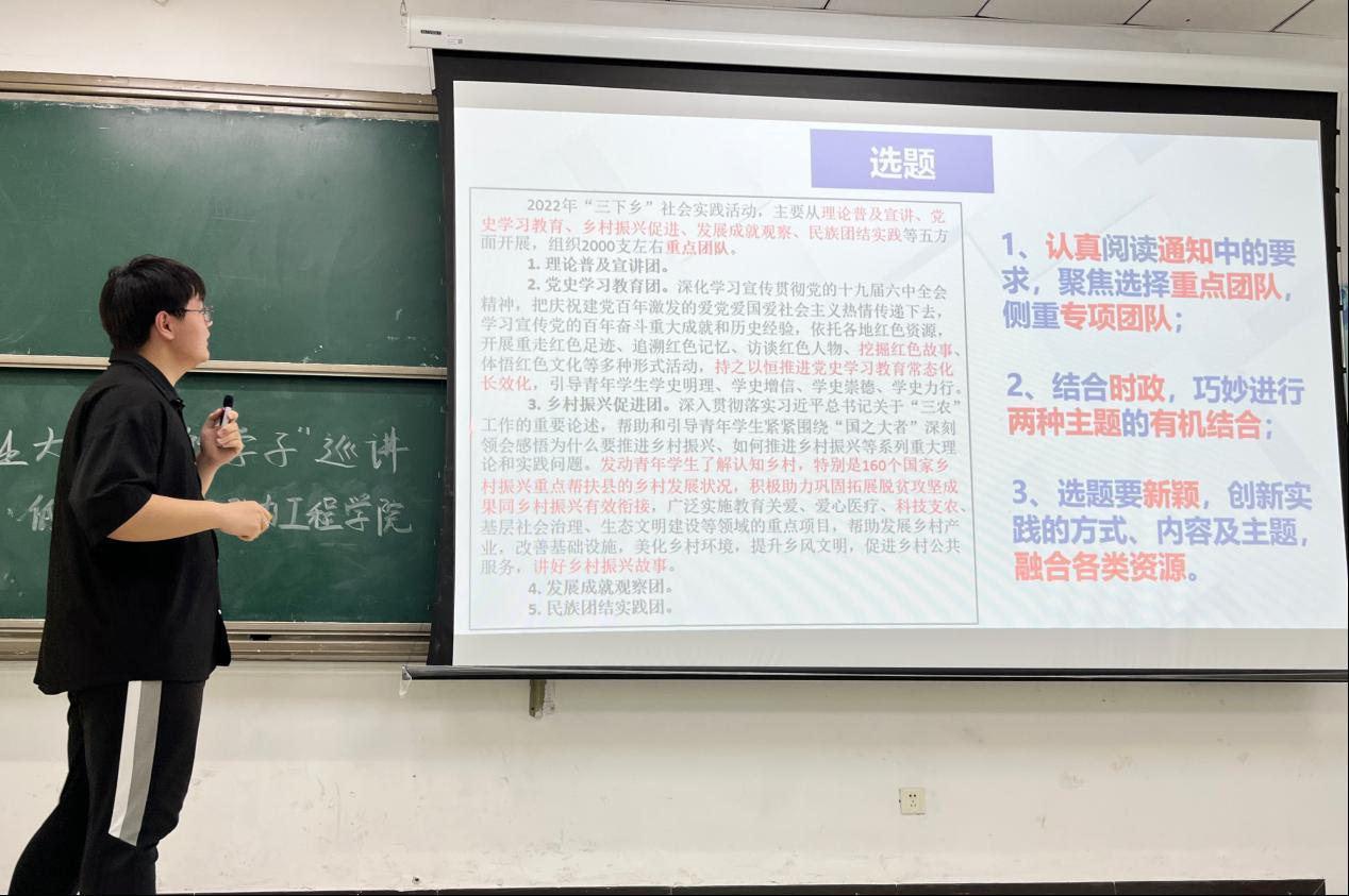 本次报告围绕“创新实践”主题展开,报告团成员结合自己的经历分别介绍了社会实践立项、宣传、展开等相关事宜。郭欣萌同学以延安社会实践向同学们介绍了团中央专项团队申报的相关流程和要求,为同学们指出了方向;同时向同学们分享了自己的团队实践过程中的精彩瞬间,她指出社会实践是一次充实有趣且意义重大的经历,各位同学可以结合家乡特色积极申报。常钧凯借助2022年徐州市社会实践优秀团队“红风助学,公益助农”社会实践团经历,着重强调了社会实践的选题、立项、组队问题,并向同学们分享了本次经历的收获。最后他提醒各位同学应以真诚的态度、怀着“嚼得菜根,做得大事”的信念努力向前,拼搏奋进。针对社会实践活动的宣传工作,李唯嘉同学从宣传的方式和意义为大家进行了介绍,并向大家分享了2021年社会实践的宣传视频。此外,三位报告者都强调了实践过程中的安全问题,提醒大家要在保证自身安全的前提下开展实践活动。