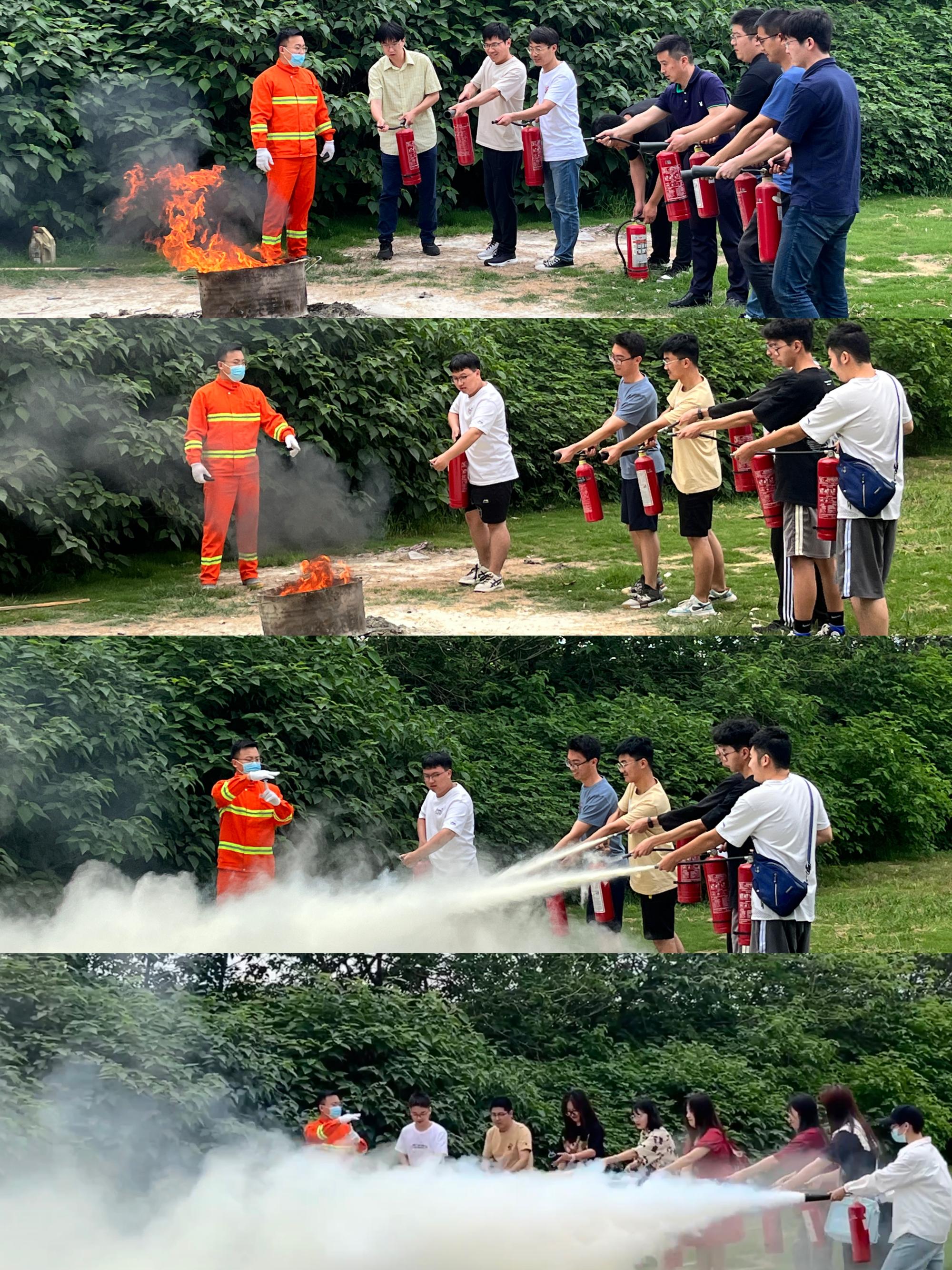 活动开始前,刘尊旭副院长强调了开展消防演练的重要意义。他指出,各位老师同学应增强安全防范意识,牢固掌握火情处置方法,筑牢安全防线。随后,王锐老师就火灾的种类、火情的发展规律、疏散逃生的要领和灭火器的工作原理进行讲解,并以“提”“拔”“握”“压”四个步骤演示了灭火器使用步骤。针对实验室中的火灾,王锐老师提醒大家要量力而为,分析火势后进行处理。遇到大火时应在确保人身安全后及时报警处理。讲解完成后,现场师生在专业人员的指导下按照步骤分组使用灭火器进行了消防灭火“实战”演练。