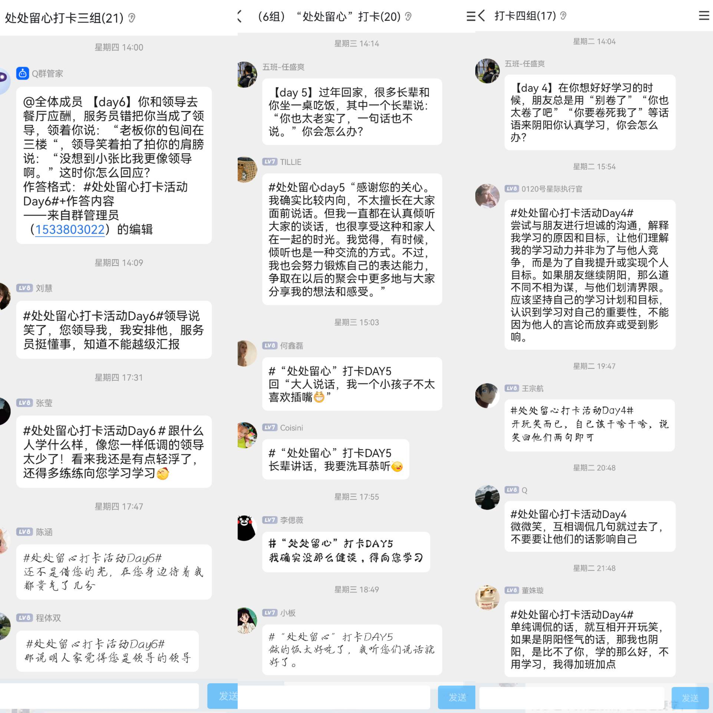 “处处留心”打卡活动自开展以来,受到了广大学生的热烈欢迎和积极参与。活动过程中,工作人员通过每天在群聊中发布一道与日常生活、为人处世相关的小问题,同学们需要在规定时间内给出自己的答案。参与活动的同学表示,此次活动可以引导大家关注身边的事物,培养创新意识和创新思维,通过回答不同的问题,帮助自己学会从不同角度思考问题,寻找解决问题的新方法和新思路。这种积极互动的交流方式,不仅激发了同学们的学习热情,提高他们的综合素质,也帮助他们在思考问题的过程中不断锻炼和提升自己的创新思维能力。