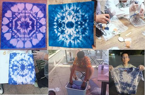 本次扎染活动采用“DIY体验”和“创意赛”相结合的形式,既增强了同学们的趣味性和参与感,也让他们在互动实践中体会到扎染技艺的独特魅力。活动现场,志愿者们为报名参与的同学们详细讲解了扎染工艺的基本知识、技巧及注意事项,包括图案设计、定位、折叠、捆扎、点缀等。在比赛环节,参与者们在主办方提供的各式织布、染料和扎染工具的基础上,充分发挥想象力,设计出自己喜爱的样式。活动正值母亲节来临之际,不少参与者选择将自己染制的方巾作为节日礼物送给母亲,简单别致且充满诚意。活动结束后,同学们表示:“报名时以为会很难,没想到真正上手后才发现这么有趣。” 参与者们纷纷表示,此次活动不仅让他们学到了知识,还让他们意识到了保护和传承非物质文化遗产的重要性。