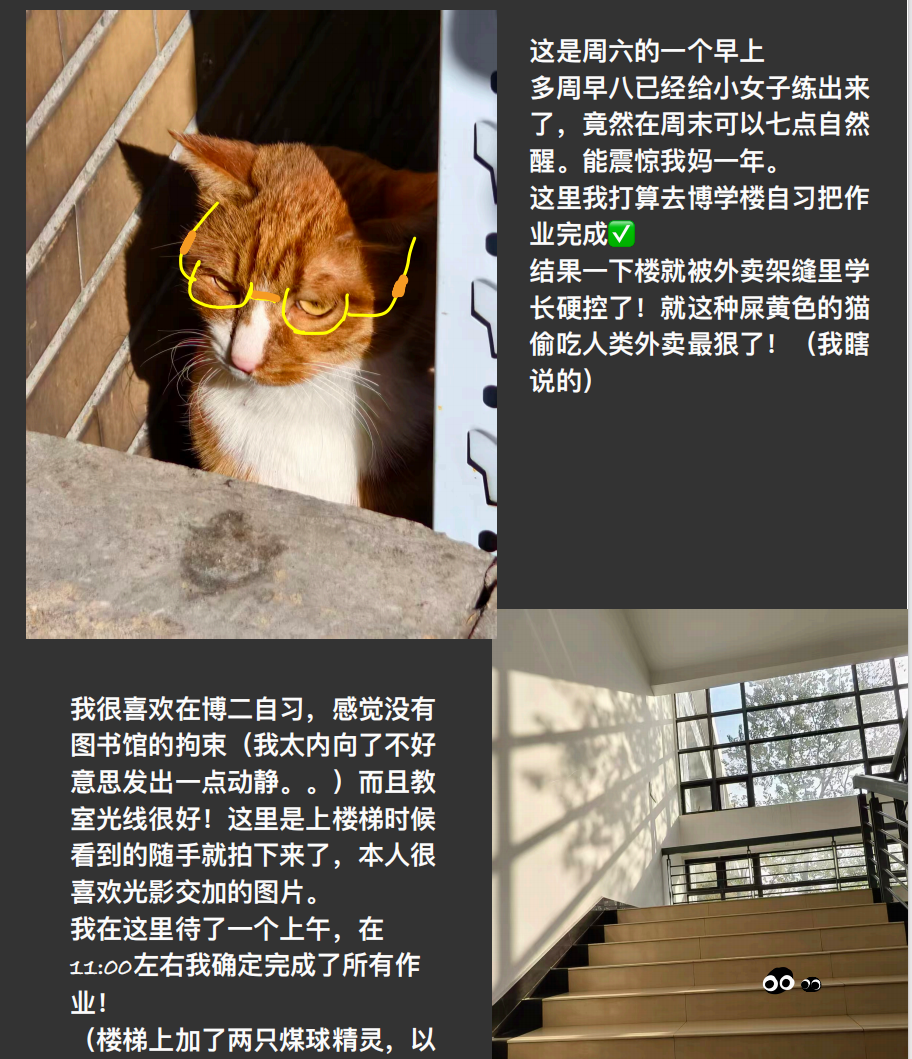 从国旗班的飒爽身影,到镜湖畔天鹅的悠然游弋;从图书馆里专注自习的安静侧影,到校园一隅晚风中消散的疲惫……投稿作品不仅捕捉了日常生活中的动人瞬间,更透露出同学们对学习、休闲与内心成长的细腻思考。本次活动不仅是一场展示比赛,更成为了同学们梳理生活、表达自我的温暖窗口。