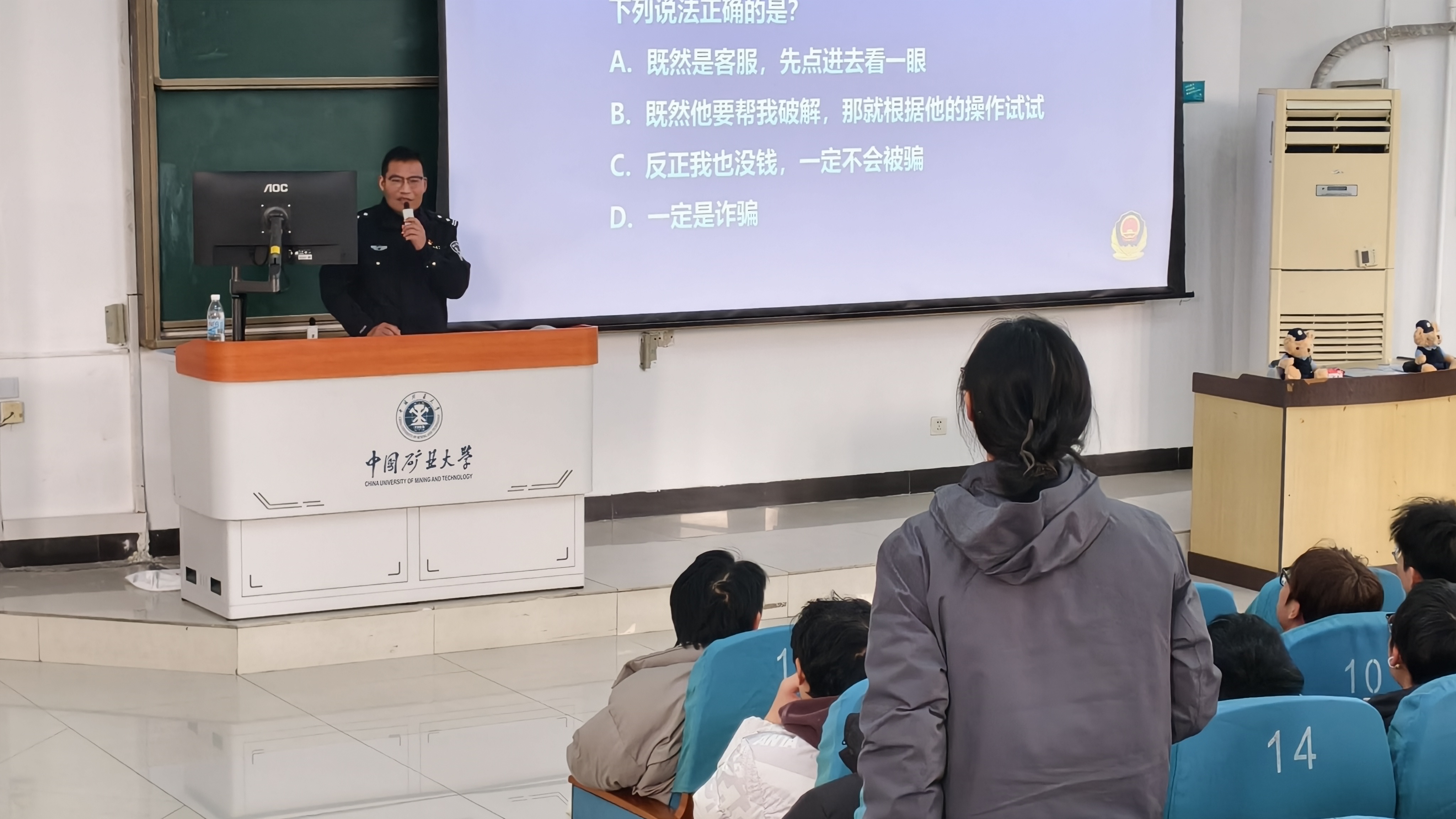 宣讲过程中,警官们首先提醒大家正视当前电信网络诈骗的高发态势,指导师生下载安装“国家反诈中心”APP,强调反诈工作对守护师生“钱袋子”的重要意义。随后,他们现场播放反诈科普视频,通过直观生动的画面,系统讲解了刷单返利、冒充电商物流客服、网络交友、虚假游戏产品交易等常见诈骗类型的作案手法,让师生对典型与非典型诈骗套路有了进一步的清晰认知。同时,警官们结合PPT中的典型案例展开详细剖析,其中既有江苏师范大学老师深陷“虚假投资理财”骗局,也有矿大学生因QQ被盗号冒充熟人借款、游戏账号交易被虚假平台诈骗等身边事例,用“身边事”警示“身边人”,让反诈宣传更具说服力与感染力。警官着重提醒,诈骗分子手段不断翻新,但核心套路不变,务必牢记“不轻信、不链接、不透露、不转账”的反诈准则。互动提问环节中,师生们踊跃举手,就日常遇到的可疑情况、反诈APP使用等问题向警官咨询,警官们逐一给予耐心解答,进一步强化师生的反诈认知。几场宣讲活动内容衔接、重点突出,分别贴合不同年级学子的生活学习场景,实现精准反诈宣传。宣讲结束后,警官还面向各宿舍和实验室分发了传单,进一步强化师生们的反诈意识。