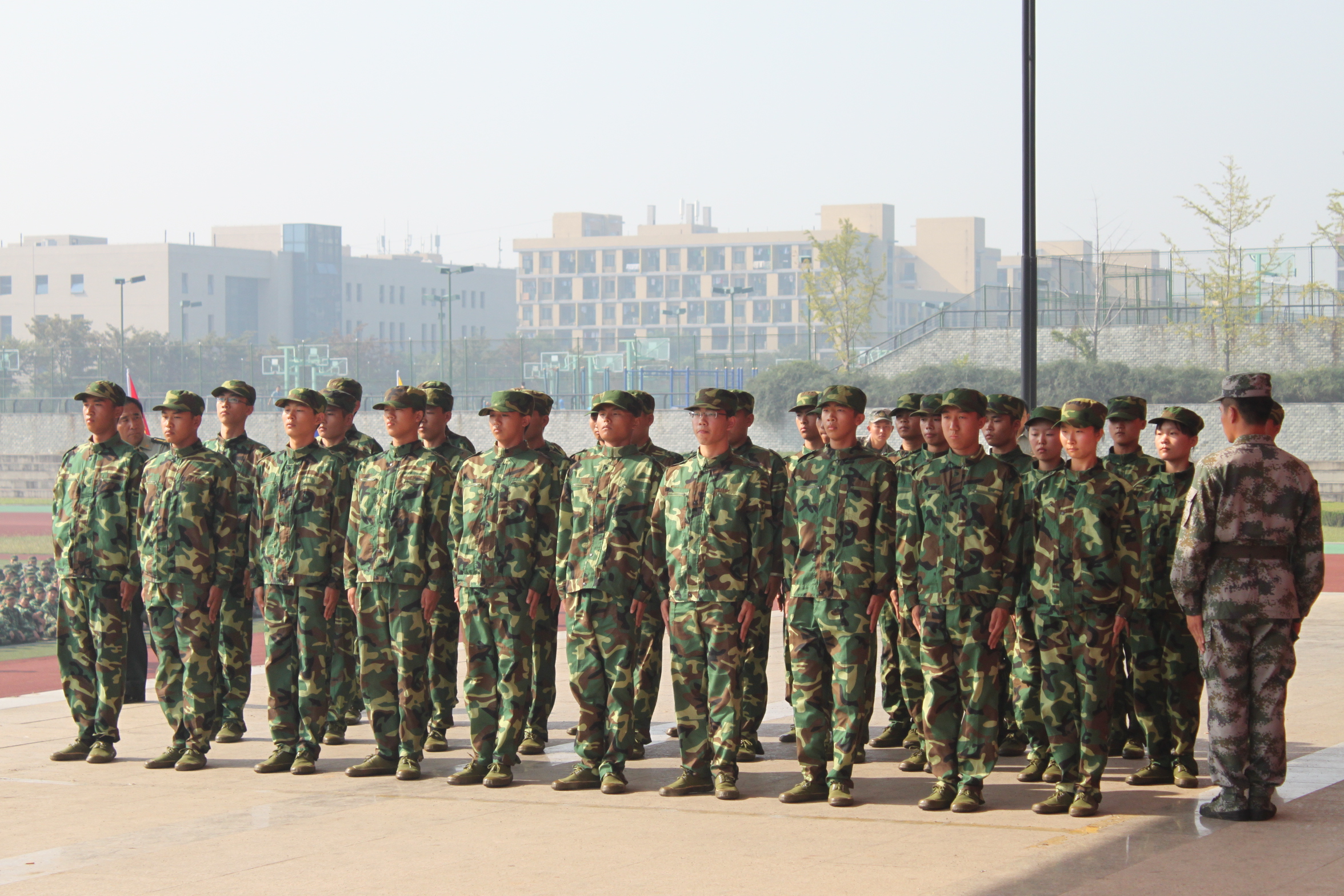 9月15日,中国矿业大学2012级新生进入了第七个训练日,各营的队列训练已基本完成,上午八时,中国矿业大学第二运动场上一片生机,全校共18个营的军训新生集结在这里,每营选出一个连等待着向大家展示这一个周的训练成果。