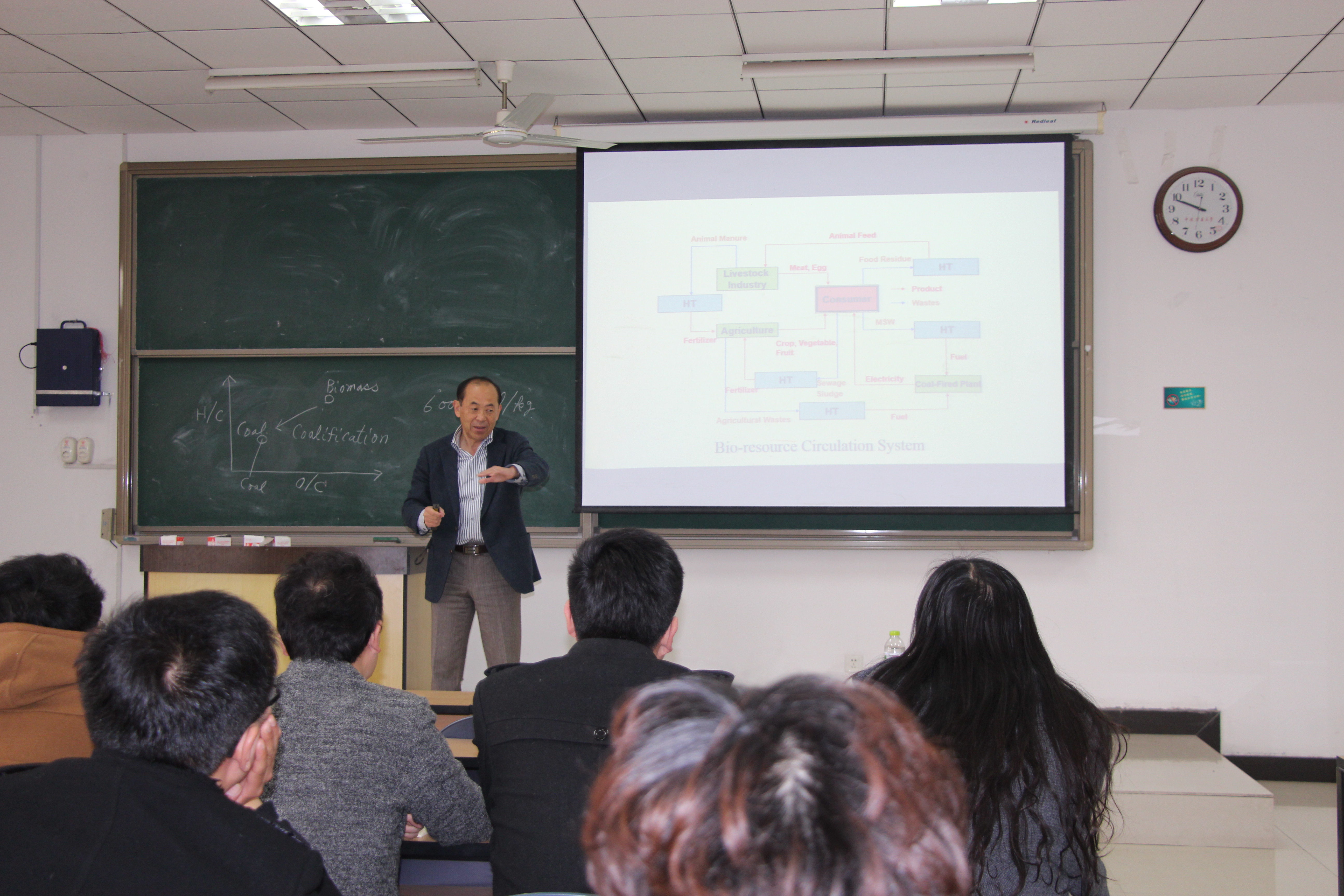 首先,吉川邦夫教授为同学们简单介绍了一下东京工业大学,在轻松的氛围中展开了报告会。吉川邦夫教授针对当前的能源利用现状,创新性的提出了废能利用的几个新方向。并通过一系列的分析结果与实验数据,详细介绍了将生物质能循环转化成煤(coalification)、污水污泥转化为化肥、塑料废弃物通过热分解转化为成石油、废物转化为天然气发电四个循环利用过程。