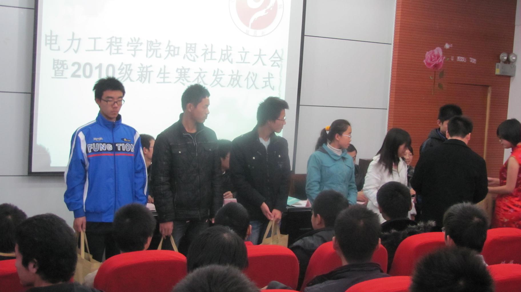 报告厅举行了知恩社成立大会暨2010级新生寒衣补助发放仪式。出席会议的有我院党总支副书记张磊、校学生资助管理科宋冰老师、院团委书记田玉河,辅导员孙婉老师、弓海军老师, 旺财28