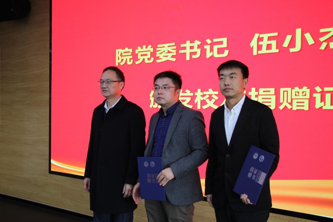 发展的企业并向校友颁发捐赠证书。院工会主席胡堃宣读企业奖学金表彰决定,与会企业校友分别为获得奖学金的学生颁发了荣誉证书并合影留念。