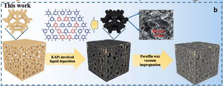 作者首先对泡沫金属/相变复合材料的最新进展。由于泡沫铜与相变材料之间的亲和性较差,为了增强其与有机相变材料的兼容性,之前的研究团队一般采用气相沉积碳材料、氧化改性等方法对铜进行改性。这些方法往往存在制备方法复杂,难以放大量制备,且制备改性铜材料导热系数也会有一定程度衰减。基于上述研究,饶中浩教授课题组尝试以FeCl3为催化剂条件下,以1,1-二甲氧基甲烷为交联剂,通过Friedel-Crafts反应,将多孔超交联高分子“编织”在泡沫铜骨架上,随后采用真空浸滞法将有机相变材料负载在泡沫铜骨架上。该方法在不破坏铜骨架的前提下,增加了通骨架与有机相变材料之间的亲和性,同时也极大增加了担载材料的比表面积。实验表明,相变的材料的最高包覆效率可达62.1%,导热系数最高可达55.37 W m-1K-1。机理研究表明,泡沫铜与高分子单体三苯基膦分子之间存在弱的配位作用,该配位作用可使高分子按照特定方向生长,形成有序多孔结构。该过程类似于海洋中的珊瑚生长模式,生长出来的高分子具有和鸟巢类似的有序多孔结构。对比实验表明,当采用其他高分子单体,如三苯基苯、苯时,形成的高分子结构为无序多孔结构。有序多孔结构一方面保证了高分子超高比表面积,另一方面也使其在吸附石蜡过程中响应更快,吸附效率更高。进一步研究表明,该复合材料具有非常优异结构灵活性,可以加工成复杂形状,同时也具有非常好的光热、光电响应与转化效率,其中光热转化效率最高可达93.8%。
