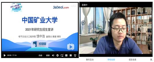 副院长饶中浩教授分别通过360教育在线和中国教育在线,进行了2021年研究生招生宣讲直播。饶中浩副院长分别从矿大简介、学科设置、师资队伍、科学研究、合作交流、近年情况、奖助政策和培养案例等九个方面,对旺财28