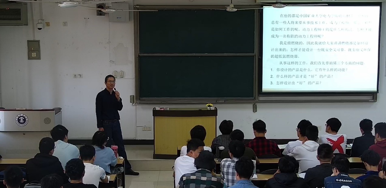 程怀志高工首先结合自身的工作经历,简单给阐述了能动专业学生学什么、做什么、怎么做,对比分析了我校毕业生与其他名校如清华、浙大能动专业学生的优劣势,鼓励学生要自信,并建议同学们有一个明确的职业规划。以《低氮燃烧器设计》为例,详细阐述了要解决的问题即降低燃烧的NOx排放,以问题为导向,循序渐进地引导学生分析问题,结合学生所学知识给出了设计思路。