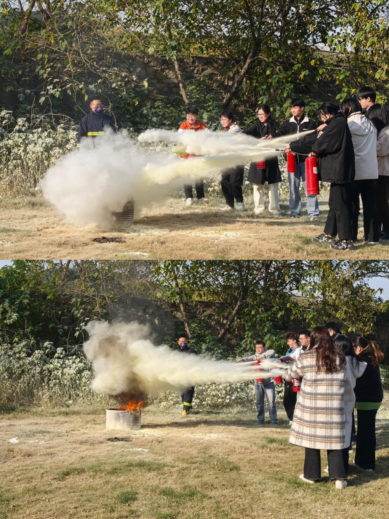 王锐老师向同学们传授灭火器“提、拔、握、压”的四字口诀及实操要点。对于两种常见灭火器的差异,他强调:干粉灭火器使用时应先垂直提起令干粉松动,后拔掉保险销,握管瞄准,压把喷射;二氧化碳灭火器则需提起后戴手套提拉握管操作。同时,针对各操作步骤关键细节与易错情形,王锐老师一一进行讲解展示,确保大家更加精准地掌握使用方法。随后,在专业指导下,同学们进行灭火器使用的现场实践,按照标准步骤依次进行摇晃、拔销等一系列操作。同时,王锐老师专注观察、适时纠正,助力大家顺利安全操作,切实掌握灭火技能。