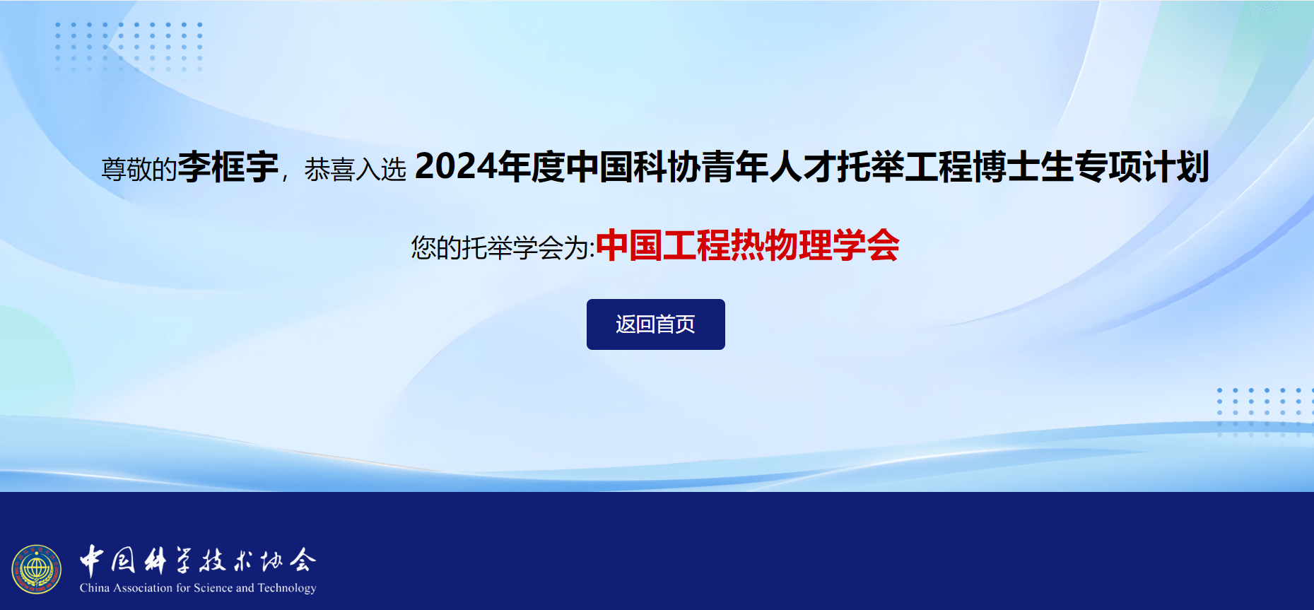 流体力学专业2021级博士生李框宇成功入选,其托举学会为中国工程热物理学会。