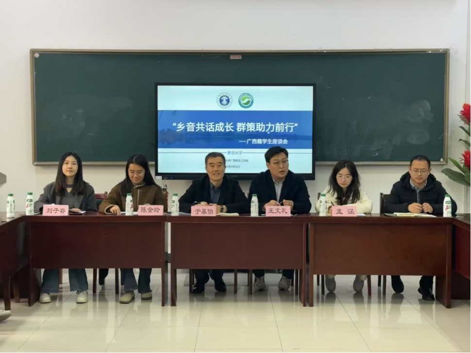 于基伯副书记简要介绍了学校近三年在广西壮族自治区的本科招生情况和本年度招生宣传工作计划,分析了学校在学科专业、校园环境、地理位置等方面的竞争优势和吸引力,鼓励同学们认真学习、积极进取,主动参与本科招生宣传相关活动。会上,老师与同学们围绕广西籍学生的本科招生宣传、生源吸引等话题展开深度交流。学生们踊跃建言:林嗣乔、覃茁等同学提出,校园环境与宿舍条件是他们报考的重要考量;同学们还建议通过拍摄校园风光、宿舍生活短视频进行社交媒体推广等形式,展现学校特点与魅力。