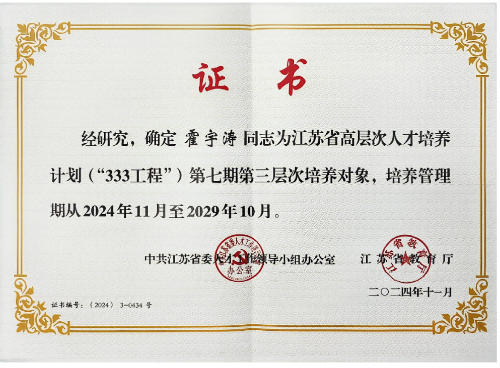 霍宇涛副教授成功入选第三层次培养对象。作为江苏省实施科教兴省、人才强省战略的重要抓手,“333工程”重点选拔在基础研究、工程技术、创新创业等领域取得突出成绩的中青年领军人才。